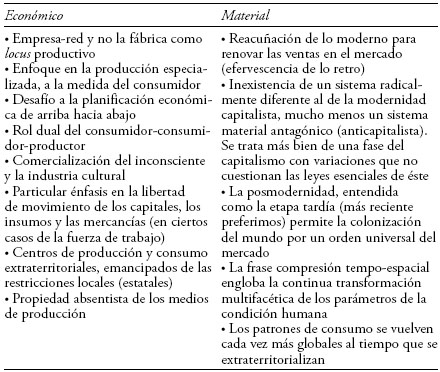 Contrario al mainstream del pensamiento marxista, el cual considera que el marco político-cultural (la superestructura social) es un producto derivado del marco económico (estructura), en el presente trabajo proponemos la idea inversa, que el marco filosófico-político-cultural, es decir, la superestructura social frecuentemente resultan ser una precondición para el correcto funcionamiento de una determinada infraestructura económica. Desde luego, no argumentaremos que tal relación jerárquica se da de forma lineal, automática ni rígida; más bien, en un sentido hegeliano, partimos de la perspectiva de que el triple marco filosófico-político-cultural desempeña una función "de arranque", y que una vez "en marcha" permite una relación dialéctica entre el marco filosófico-político-cultural de la posmodernidad (véase cuadro 1) y el marco económico-material de la globalización (véase cuadro 2). Al considerar la relación dialéctica "ya" establecida, desaparece la necesidad de jerarquizar la relevancia, y hace inútil una discusión de cuál de los marcos condiciona al otro, pues habiéndose normalizado el nuevo paquete de desarrollo se condicionan uno al otro de forma incesante.