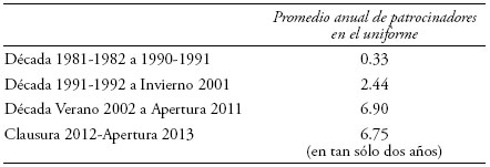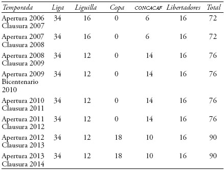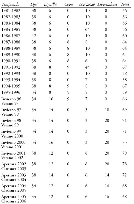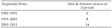 5) La estabilidad de un equipo también puede ser ilustrada por la estabilidad de los directores técnicos. Quizá producto de que Morelia asciende para la temporada 1981-1982, el primer lustro del equipo presenta una cierta volatilidad de directores técnicos, habiendo incluso una serie de interinatos por uno o dos partidos.22 Si atendemos las cifras duras, éstas muestran lo siguiente: en la década 1981-1991 hubo un total de 6 directores técnicos en Morelia. Dos décadas más tarde, en un lapso también de 10 años, en el periodo 2001-2011, hubo un total de 14 directores técnicos. Asombra también la estabilidad lograda para los lustros 1986-1991 y 1991-1996 (de hecho desde 1984 hasta 1995) cuando hubo un solo director técnico, Antonio Carbajal.