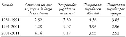 2) En la permanencia con el Club Morelia, el jugador promedio permanecía 4.36 temporadas en la institución durante la década de 1981-1991; para la década 2001-2011, el jugador promedio permanecía sólo 3.55 temporadas en la institución, lo cual representa una permanencia 18.58 % menor que la que registraba el jugador promedio dos décadas antes.