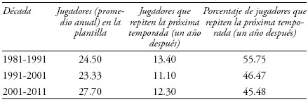 3) El jugador promedio, en la década 1981-1991, permanecía en cada club profesional de primera división en el que jugaba por espacio de 3.85 temporadas, mientras que dos décadas más tarde (2001-2011) permanecía sólo 2.52 temporadas, lo que representa 34.55% menos tiempo en cada equipo en el que se juega.