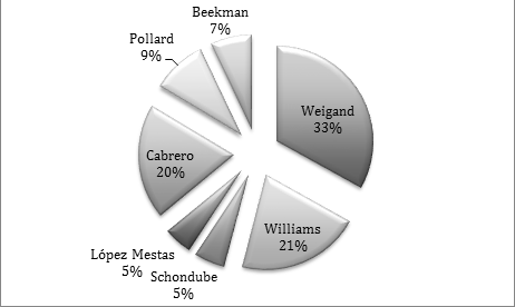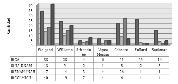 Los resultados muestran que las obras más voluminosas corresponden a las escritas por Weigand, con 33 % del total analizado (este porcentaje fue estable en los análisis por biblioteca, excepto en el AT-INAH que no se incluye en la gráfica, pero incluso al hacerlo el porcentaje de Weigand se mantiene en 30 %). Por supuesto que existen condiciones y particularidades de contenido de la obra y razones de existencia en una colección. Por ejemplo, los autores mostrados aquí fueron seleccionados a partir del criterio de mayor cantidad de obras publicadas en GA, por otro lado, hay investigadores que a pesar de ser significativos en el Occidente como Joseph Mountjoy, no aparece en la muestra debido a que las entradas con sus obras fueron escasas.4 El presente ejercicio es un primer acercamiento que busca relacionar los resultados con el argumento principal, no se pretende un estudio estadístico completo, los resultados presentados aquí son sólo un dato más que muestra la presencia que tienen las narraciones de Weigand.