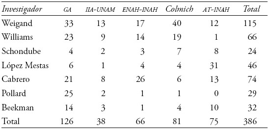 En la columna de GA (cuadro 1) encontramos una diferencia en cantidades de obras referidas de Weigand (33), frente a, por ejemplo, Lorenza López Mestas, quien sólo tiene 6 entradas. Esto contrasta con la información en el AT-INAH, donde se invierte la proporción de 31 entradas de López Mestas y 12 de Weigand. Estos números nuevamente hay que ponderarlos, pues, el personal de arqueología en el INAH tiene funciones que incluyen rescates, salvamentos, así como la obligación interna de entregar informes de sus actividades profesionales, mientras que los investigadores externos presentan informes parciales o finales de sus trabajos de campo y análisis por lo que sus cantidades serán menores. Una comparación más objetiva sería entonces Weigand con 33 entradas frente a Christopher Beekman con 4 entradas en GA, mientras que en el AT-INAH tenemos 12 Weigand por 10 de Beekman, este último mucho más equilibrado en cuanto producción de informes y, por tanto, al posible impacto en la comunidad especializada.