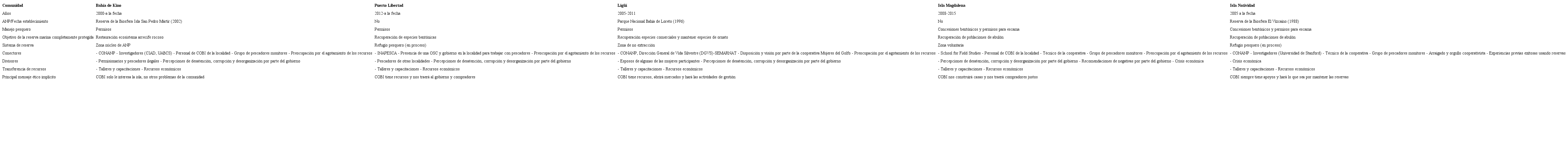 4. Isla Magdalena es la más grande del complejo lagunar Bahía Magdalena. En la isla está la SCPP Bahía Magdalena, que tiene los permisos para la explotación de escama y concesiones de recursos bentónicos (abulón y langosta). También en la isla se realizan actividades de turismo, como la pesca deportiva y la observación de ballenas. En ella habitan 200 personas, pero puede aumentar a 500 personas dependiendo la pesquería que se esté realizando en la temporada. COBI trabajó con la cooperativa entre el 2008 y 2015 en el diseño, implementación y evaluación de una reserva marina voluntaria (Villaseñor-Derbez et al., 2015). Como parte del proceso, se hicieron talleres, así como se capacitó a los buzos comerciales de la comunidad en técnicas de monitoreo submarino (Fulton et al., en prensa). En el 2009, las casas de la comunidad quedaron en su mayoría destruidas por el huracán Jimena, en ese mismo año se había establecido formalmente entre COBI y la cooperativa, la reserva voluntaria. La comunidad no podía permitirse dejar de pescar ante tal situación, por lo que COBI se comprometió a buscar soluciones para reconstruir el pueblo a cambio de que no se abriera la reserva. Entre 2009 y 2014 se trabajo con miembros de esta comunidad en el diseño y construcción de la Asamblea de Socios de la cooperativa, usando ecotecnologías (Murillo y Lejbowicz 2014); así como en planes para continuar la construcción de viviendas. Sin embargo, en enero 2015, la cooperativa decidió abrir la reserva debido a una crisis económica interna; por lo que solicitaron mayor cuota de captura de abulón (Haliotis spp) a investigadores del INAPESCA (Instituto Nacional de Pesca y Acuacultura), quienes sugirieron abrir la reserva para obtener mayor cuota (P. Sierra, comn. pers.). En esta misma fecha la cooperativa dio aviso a COBI de no querer continuar colaborando con la organización.