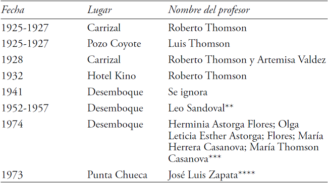 Para 1932, otra escuela fue restablecida en una de las habitaciones del Club Deportivo, para entonces abandonado, la cual estuvo a cargo de Roberto Thomson. Los indígenas Roberto Thomson Herrera, Ignacio Romero y una estudiante de nombre Ramona aprendieron a leer y a escribir en esta ocasión.32 Nuevamente, el funcionamiento de la escuela fue de corta duración, además de haberse observado la deserción del alumnado indígena por la presencia de estudiantes mestizos. En este año, Thomson dejó de asistir a los seris y tuvo que abandonar el proyecto forzado por los propios indígenas (Marak 2009, 101). En años posteriores se fundaron al menos otro par de escuelas, entonces en la comunidad de Desemboque, a donde se mudó una parte de la población comcáac a partir de 1941; la escuela en este lugar corrió la misma suerte de contar con poco alumnado y ser clausurada al poco tiempo. Para finales de esa década, en Desemboque, un comerciante recibía salario como maestro, pero no tenía alumnos, por lo cual no impartía clases (Bourillón 2002, 34 y Krekler 1949).