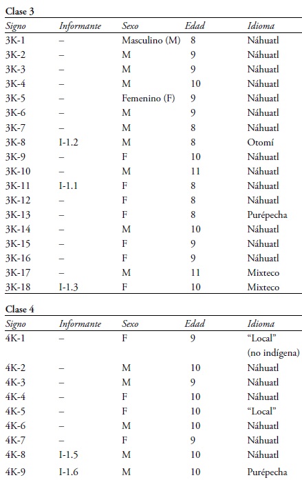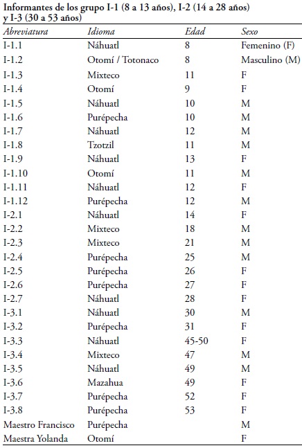La autora entrevistó a 29 indígenas3 con cuestionarios estandarizados y entrevistas: doce niños de 8 a 13 años,4 a siete adolescentes y adultos jóvenes entre las edades de 14 a 28,5 a ocho adultos de 30 a 53 años6 y a dos profesores indígenas de la escuela intercultural Nenemi. Los encuestados forman parte de seis etnias: diez nahuas, nueve purépechas, cuatro otomíes, cuatro mixtecos, una mazahua y un tzotzil. Además, se elaboraron perfiles sobre los conocimientos de idioma de los alumnos de la escuela Nenemi.