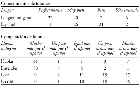 Los profesores indicaron que 22 niños dominan perfectamente su lengua vernácula, 20 muy bien, dos bien, y seis la entienden solamente.19 Según especifican los maestros sólo uno de los niños habla el español perfectamente, 26 muy bien, 21 bien, y en dos estudiantes los conocimientos de español se limitan al uso pasivo de la lengua. 41 alumnos hablan su lengua autóctona mucho mejor que el español, siete niños, sin embargo, mucho peor. 38 alumnos entienden el idioma indomexicano mucho mejor, sólo cuatro lo entienden igual de bien que el español y tres peor. Solamente dos niños saben leer mejor en su lengua indígena que en español, once lo hacen igual de bien en ambas lenguas, mientras que 36 alumnos pueden leer peor en su lengua indígena en comparación con el español, 17 de ellos incluso lo hacen notablemente peor. Los resultados respecto a la escritura se asemejan a éstos de la lectura.
