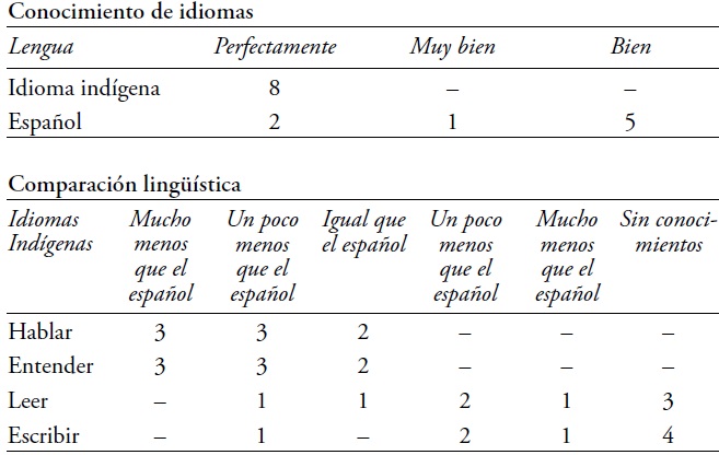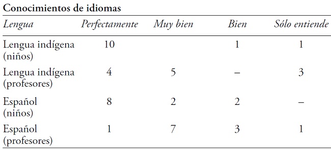 En una pregunta más matizada los niños tenían que comparar sus conocimientos de los dos idiomas: siete de ellos indicaron poder hablar y entender ambas lenguas igual de bien. Los profesores, en cambio, sostuvieron que siete alumnos hablaban y entendían su lengua indígena mucho mejor que el español y solamente tres o cuatro alumnos tenían conocimientos iguales o mejores al español.
