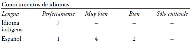 Las respuestas del grupo I-3 están aún más alejadas de las del grupo I-1.23 Los ocho encuestados dominan su lengua indígena enteramente. Sin embargo, sólo dos de ellos conocen el español perfectamente, uno lo sabe muy bien y cinco bien.
