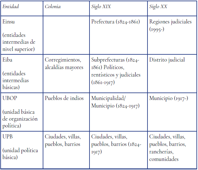 Bajo el término entidades intermedias básicas (Eiba) se agrupan los corregimientos y alcaldías mayores de la Colonia, las subprefecturas de la primera mitad del siglo XIX y los distritos judiciales del siglo XX. Dentro de las Eiba están las entidades de nivel inferior, es decir, las municipalidades y los municipios del siglo XIX y los municipios del XX.
