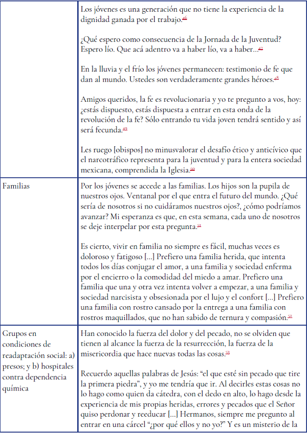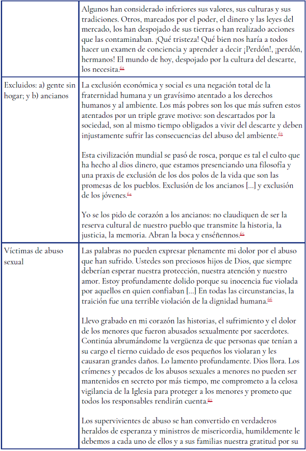 En el cuadro 1 se presentan algunos de estos códigos; son muestras de maneras de decir las significaciones pastorales de la misericordia a quienes la palabra puede “tocar el corazón”, porque se sabe que en “esos corazones” hay experiencias que comprenden y se enlazan con los mensajes. La limitación de este cuadro para “evidenciar” como dato lo anterior es que no permite articular todo el proceso de interacción entre Francisco con las personas, grupos y grandes colectivos en las circunstancias donde ocurrieron estos encuentros.