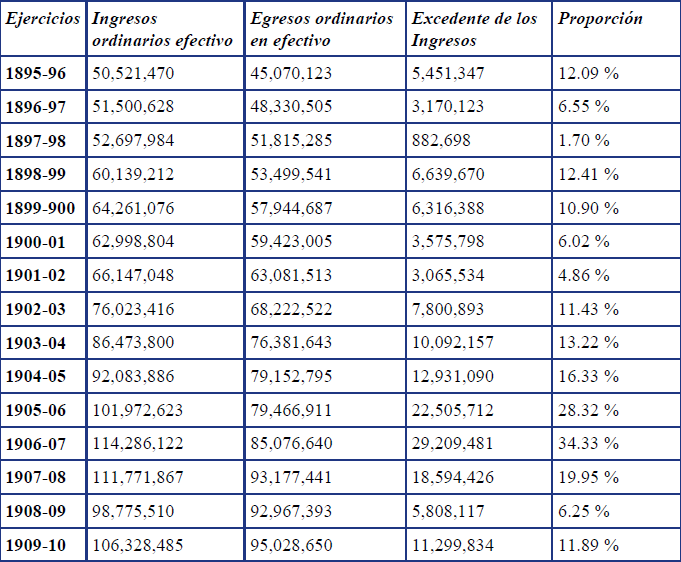 Para al año fiscal de 1909 a 1910, la Memoria fue presentada por el subsecretario, Roberto Núñez, debido a la ausencia del titular de la Secretaría. En ella de alguna forma se resumía y se realzaba en forma clara y contundente lo que se considera el principal logro hacendario de esta administración: el superávit presupuestario. En el primer cuadro que se presentaba en la Memoria (segunda hoja de la parte expositiva) se detalla y contrasta el superávit con el ejercicio anterior para hacer aún más evidente su crecimiento.79 Vemos entonces que la Cuenta del Erario se presentaba de la siguiente manera: