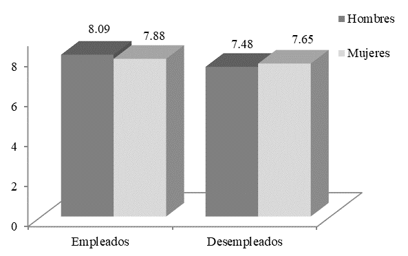 La gráfica 9 muestra los niveles de satisfacción con la vida de los empleados y los desempleados en el país por sexo. En las personas que cuentan con un empleo, la satisfacción es mayor en los hombres que en las mujeres, 8.1 y 7.9 respectivamente. Esta tendencia cambia para el caso de los desempleados, donde el promedio es ligeramente mayor para las mujeres.