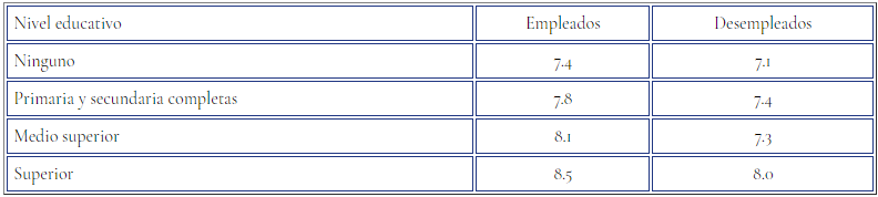 Existe una tendencia definida al alza en relación con los niveles de estudio y la satisfacción con la vida para las personas empleadas, que va de 7.4 para los que no tienen ningún tipo de estudios a 8.5 para los que tienen estudios superiores. En cambio, en el caso de los desempleados los niveles de satisfacción no presentan la misma claridad (véase gráfica 10).