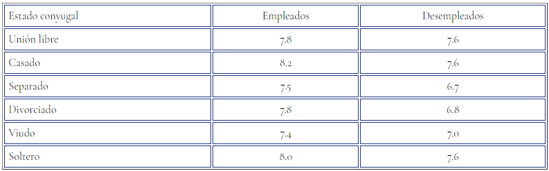 La situación conyugal de las personas es otro aspecto que determina su bienestar subjetivo. Aquellas que declararon estar casados (a) o vivir en unión libre, es decir, que dijeron tener una relación sentimental, ven incrementado su bienestar subjetivo con la vida 30.79 % más en relación con las que son solteros (a), divorciados (a), separados (a) o viudos (a). Particularmente, en las personas desempleadas no existe una diferencia significativa en relación con este aspecto.