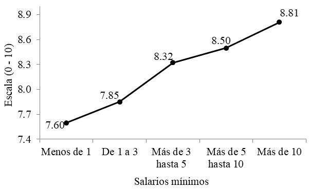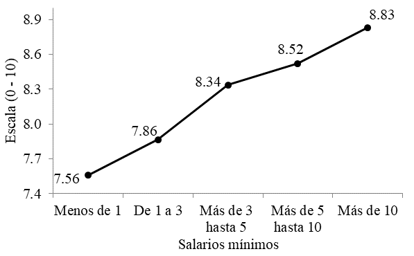 Los ingresos son otra variable que muestra una tendencia definida en relación con el bienestar subjetivo de las personas. Los menores promedios de satisfacción con la vida se encuentran en los rangos de menores ingresos, y conforme éstos aumentan, se observan mayores promedios de satisfacción. La diferencia entre el bienestar que reportan las personas que reciben menos de un salario mínimo mensual y las que obtienen más de 10 salarios, es de 1.21 puntos en promedio (véase gráfica 7).