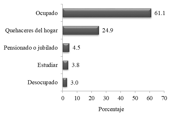La actividad que sigue en orden de importancia porcentual son las personas que se dedican a los quehaceres del hogar con 24.9 % (véase gráfica 1); la gran mayoría de este porcentaje, 97 %, son mujeres, contra el 3 % registrado para los hombres. Tradicionalmente, las mujeres están dedicadas a los quehaceres del hogar; aunque paralelo a estos datos y debido a la incursión de la mujer al mercado laboral, la tasa de participación económica femenina, que se refiere al porcentaje de mujeres en edad de trabajar que pertenecen a la Población Económicamente Activa (PEA), ha aumentado en las últimas décadas, de 19.6 %, en 1990, a 42.8 % para el año 2012 (Barrios y Barrios 2016, 42).