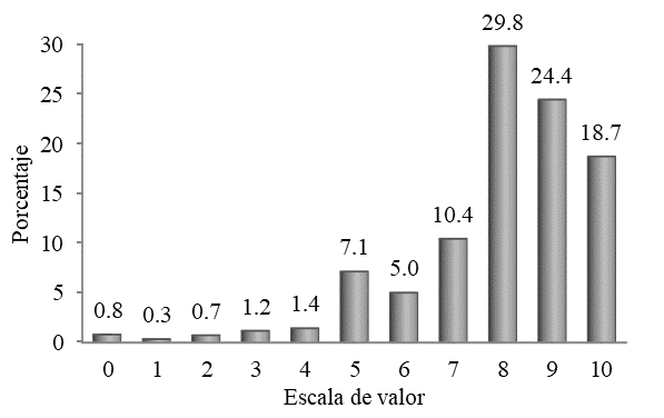 Como se muestra en la gráfica 2, los mayores porcentajes de respuesta se encuentran en las valoraciones de 8, 9 y 10, que representan las más altas en la escala utilizada. En total, estas tres categorías suman un porcentaje de 73 %, del otro lado, es decir, las de mayor insatisfacción con la vida (0 al 3), únicamente representan 3.1 %. Esta diferencia también puede notarse entre los extremos, es decir, la categoría 0 (total insatisfacción) y 10 (total satisfacción), que presentan una diferencia de 18 % a favor de la total satisfacción.