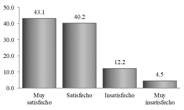 Empleando la misma escala de valor (0-10), el INEGI utiliza cuatro criterios o categorías para presentar los resultados en relación con el bienestar subjetivo. Así, las personas que contestaron 10 y 9 se catalogan como muy satisfechas, 8 y 7 como satisfechas, 6 y 5 insatisfechas y del 4 al 0 muy insatisfechas. Siguiendo la misma tendencia, las categorías de satisfacción suman 83.3 %, mientras que las personas que contestaron estar insatisfechas o muy insatisfechas con su vida representan 16.6 %.