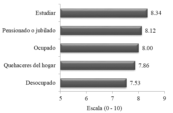 A la categoría anterior, le sigue en orden de importancia el promedio de bienestar subjetivo que manifiestan los pensionados o jubilados en el país, que se ubica en 8.12. Las personas que cuentan con un empleo, presentan un promedio de satisfacción con su vida de 8.0, que ocupa el tercer lugar en orden de importancia del resto de categorías analizadas, mientras que el promedio de satisfacción para las personas que se dedican a los quehaceres del hogar, la gran mayoría mujeres (97.1 %), es de 7.86.