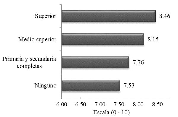 Los niveles educativos son buenos predictores del bienestar subjetivo de las personas, pues, conforme aumentan, los individuos incrementan su satisfacción con la vida. Las personas que declararon contar con estudios de educación media superior o superior, es decir, preparatoria o bachillerato, normal o carrera técnica/comercial, o bien, que cuentan con estudios superiores como profesional, maestría o doctorado incrementan su bienestar subjetivo 50.04 % en relación con las que no realizaron ningún tipo de estudios o cuentan con cualquier otro nivel educativo. Tomando en consideración únicamente a las personas desempleadas, el porcentaje de satisfacción con la vida de las que cuentan con los estudios mencionados baja a 30.48 %, a un nivel de confiabilidad del 90 %.