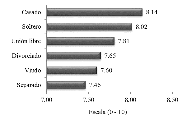 Las personas casadas son las que expresan mayor promedio de satisfacción con su vida, 8.14, seguidas de los solteros que también presentan un alto promedio, 8.02. En tanto, los que se encuentran separados tienen los menores promedios de bienestar subjetivo, 7.46 (véase gráfica 6).
