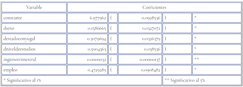 Ya que el propósito del presente trabajo no es ofrecer una explicación sobre el concepto de bienestar subjetivo o satisfacción con la vida, sino establecer en qué medida dicha satisfacción se presenta de manera diferenciada para las personas con un empleo en relación con las desocupadas, se ha justificado la utilización del modelo dada la significancia particular de sus variables, es decir, se recurre a la particularidad de los parámetros, más que a la significancia conjunta o variación total.16 Además, también es utilizado para establecer signos de las relaciones entre variables.