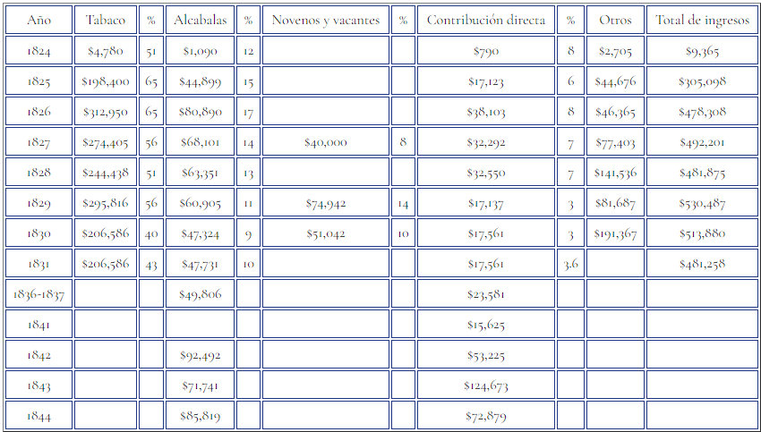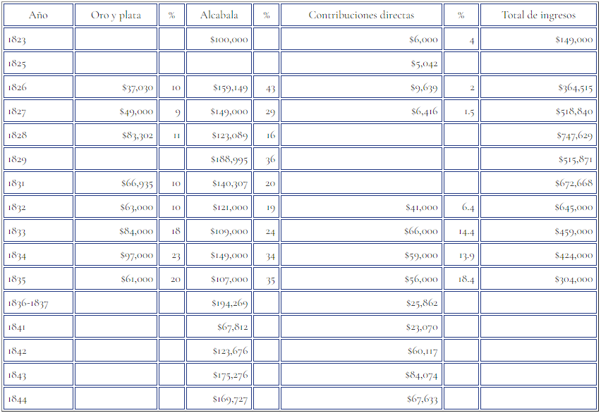 Entre 1824 y 1830 las contribuciones directas a nivel nacional alcanzaron entre 7% y 11% (afectaba a la propiedad, a la renta o a las personas, según cada estado), siendo el estanco del tabaco el que más aportó, con 32%, seguido de la alcabala al comercio interno, con 27%, como también pasó en Michoacán, veremos que Guanajuato difirió por los ingresos sobre plata (Sánchez, 2009, pp. 87, 299). De 1831 a 1834 los impuestos directos representaron 9% para los estados, un comportamiento en aumento, contrario a Michoacán y Jalisco.22