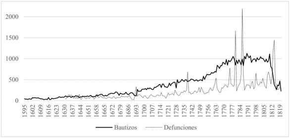 En el presente artículo se intenta identificar el desarrollo poblacional de Valladolid a través de la captura, análisis y crítica de los registros de bautizos y defunciones entre los años 1594 y 1820. Así como conocer los vaivenes que sufrió la población a lo largo de poco más de dos siglos, en los cuales se hicieron presentes constantes crisis de mortalidad que cobraron la vida de una cantidad importante de habitantes y que llegaron a causar el descenso de los bautizos. A lo largo del periodo de estudio se tuvo un crecimiento poblacional pese a la presencia constante de epidemias.