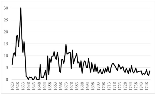 A continuación, se observa un crecimiento que terminó entre los años 1676 y 1695 cuando llegaron varias epidemias: viruela en 1680 y 1692 y sarampión en 1693 (Talavera, 2018, pp. 136-137). Estos avatares se pueden rastrear a partir de las solicitudes de intercesión divina por la feligresía, así se hicieron varias rogativas al Cristo de las monjas de Santa Catalina, en 1689 por el mal temporal y epidemia, en 1692 por la abundancia de enfermedades y en 1696 por toda clase de achaques y la nula presencia de lluvias (Sigaut, 1991, pp. 40-41).