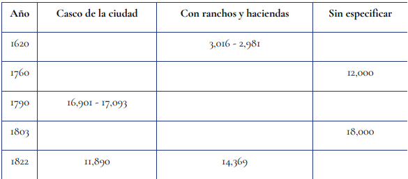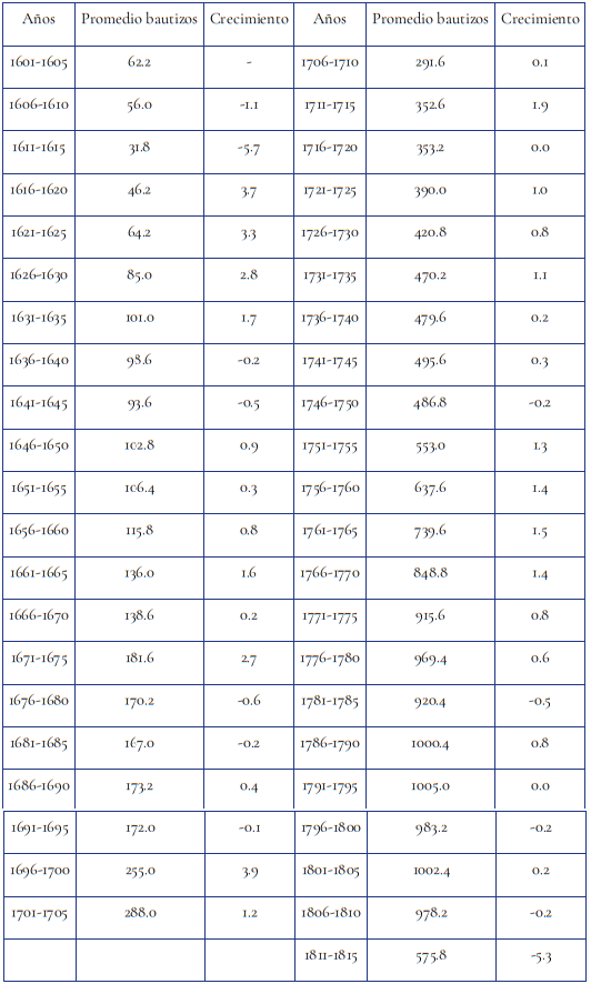 Los promedios de bautizos evidencian el crecimiento de habitantes. A inicios del siglo XVII rondaba la media centena, pasado el primer tercio de la centuria alcanzó el centenar. A inicios del siglo XVIII rebasaron los 200 bautizos, a la mitad de esta centuria llegaron a 500 y a fines subieron hasta los mil, posteriormente cayeron a la mitad durante la independencia.