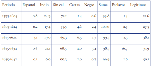 Con excepción del último lapso, el periodo se dividió en decenios para hacer un mejor análisis. Los españoles tuvieron una presencia baja, no pasaron del 1%, salvo entre 1615 y 1624. Los indígenas conservaron una presencia constante, exceptuando el periodo entre 1635 y 1642 cuando descendieron notablemente. Las castas también presentaron variaciones, aunque con cifras bajas. Los bautizados sin calidad fueron mayoría, con rangos de entre 68% y 88%, el dato más bajo corresponde al periodo entre 1615 y 1634, cuando, por consecuencia, aumentaron los indígenas, castas y españoles. Los negros mostraron una menor proporción, entre menos de 1% y hasta 3.4%. Los esclavos arrojaron un comportamiento fluctuante, entre 1625 y 1634 tuvieron la cifra más alta con 16.7%; en el año 1631 llegaron a conformar el 30% del total de bautizados, lo que da cuenta de una importante aportación, seguida de un fuerte descenso. La ilegitimidad mostró cifras altas que tendieron al crecimiento, de ser un poco más de un quinto de los bautizos llegaron a ser la mitad a fines del periodo.