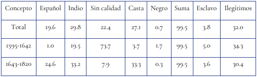 En las actas de bautizo de la época colonial debía anotarse una calidad para el recién nacido, lo que en teoría determinaba sus derechos y obligaciones en una sociedad estamental regida por varios aspectos, entre ellos el origen racial. Los españoles estaban en la cúspide, y en la medida en que uno se distanciaba de la blanquitud se descendía paulatinamente en la escala social. Para tal efecto se analizó la calidad de los bautizados en dos periodos: 1595-1642 y 1643-1820.