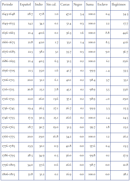 Los españoles, de 1% subieron a una cuarta parte del total; los indios, por su parte, aumentaron en número de casi 20% a 33.2%; las castas, de poseer una presencia mínima en los registros llegan a conformar un tercio de estos. Los negros fueron los únicos que disminuyeron en número, de 5% a 3.6%, lo que va de la mano con el declive de la esclavitud. Los ilegítimos, mantuvieron cifras altas, aunque bajaron un poco de 34.3% a 30.4%.