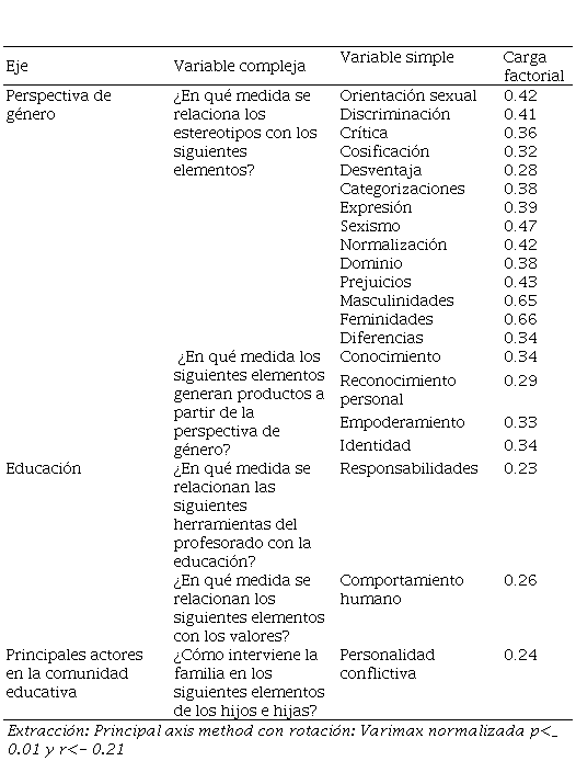 Los factores que sostienen el paradigma encontrado se analizaron por Comunalidades Múltiple 𝑟2 con Varimax Normalizada, con un nivel de error p≤ 0.01 y de confianza del 99.99 % y un r=0.21 que explican un 30.34% del fenómeno estudiado. En los factores encontrados en el Análisis factorial exploratorio se puede observar la relación entre la violencia de género y la comunidad educativa en el factor 6 “Relación de violencia de género en comunidad educativa”, mostrada en la Tabla 2.