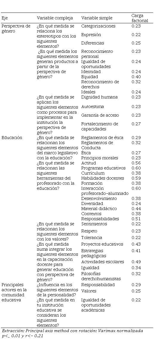 El comportamiento mostrado en la tabla anterior advierte que la población encuestada considera 39 variables con perspectiva de género, mismas que la comunidad educativa debe atender en la educación para generar productos, aplicar procesos y utilizar herramientas que influyan en la personalidad. Los principales procesos que se sugiere que las instituciones educativas deben implementar para eliminar este tipo de violencias se inclinan por las capacitaciones docentes y la implementación del marco legislativo. Las variables con más carga factorial de las 39 significativas refieren a la responsabilidad de los docentes de utilizar sus habilidades enfocadas en estrategias pedagógicas y proyectos educativos basados en formación con filosofías derechohumanistas que eliminen la violencia de género.