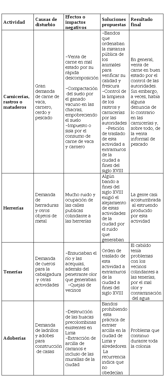 Las actividades productivas en la ciudad de Lima producían alteración del paisaje, ensuciaban el aire, el suelo y las aguas, y generaban ruidos e incendios. Su mala manipulación también podía causar enfermedades, envenenamientos, pestes e incluso desestabilizar la economía local. El cabildo controlaba y vigilaba estas actividades a través de sus inspecciones oculares llevadas a cabo periódicamente por especialistas y regidores. Otras autoridades participaban, como el juez de aguas, el procurador general de la ciudad o el intendente de policía que surgió a fines del siglo XVIII dentro de las reformas del Despotismo Ilustrado. Los virreyes estaban bastante presentes en las decisiones finales.