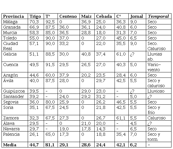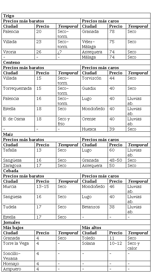 Los datos brutos del temporal están sistematizados en los Cuadros I y II. Con un vistazo rápido podemos ver los cereales más caros y baratos, cómo fluctuaban, dónde se vendían -junto al estipendio de los jornales- y qué condición meteorológica adversa o favorable les intervino. El papel que se le concedió al clima determinó la oscilación de los costes en según qué cereal y lugar. El trigo fue el producto que más se vio alterado por la meteorología frente a la cebada, esencialmente en Andalucía y Murcia por la sequedad; y en Galicia por unas “lluvias abundantes” con Zamora, Álava, Navarra y Palencia en contraposición. Además, también es muy interesante advertir cómo el nivel de los jornales iba en proporción al valor del mercado de la fanega castellana. Esto corrobora la necesidad de cruzar los datos disponibles y, en suma, realizar un ejercicio similar con los índices de otros autores.