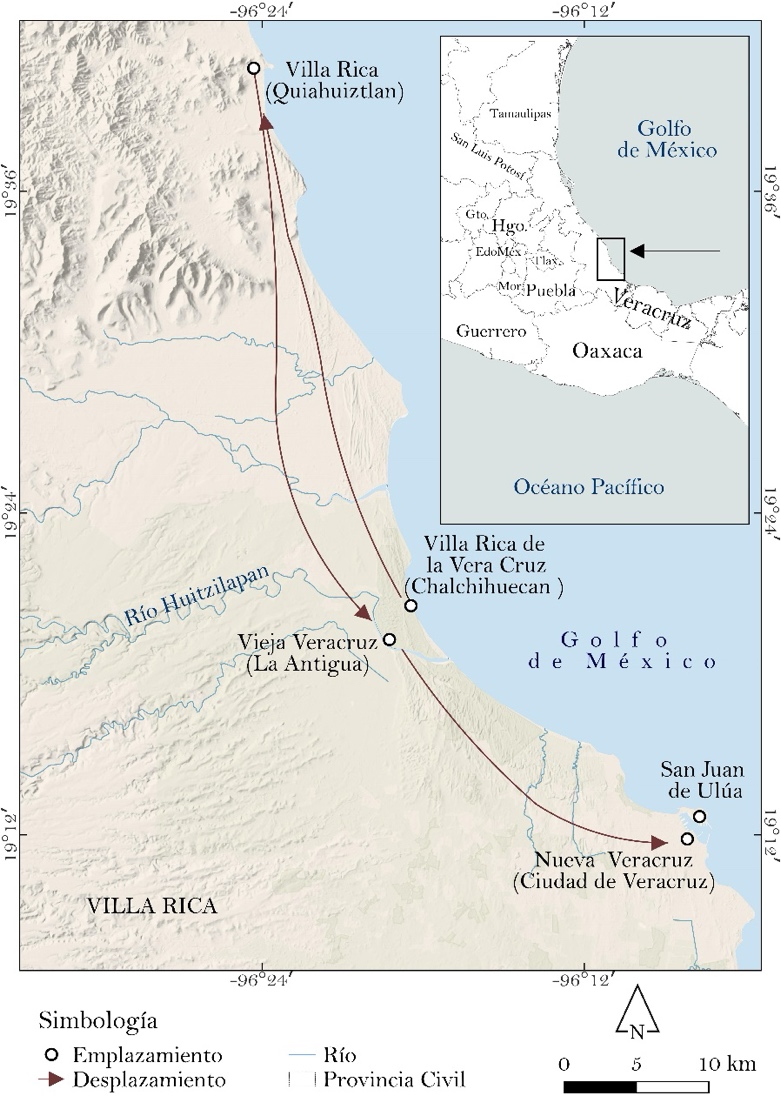 La temporalidad de este estudio se enmarca en la segunda mitad del siglo XVI, periodo formativo y transicional para una joven y frágil ciudad apenas fundada en 1519 que desde sus inicios tuvo una formación social inestable. Esta Veracruz experimentó tres desplazamientos durante el siglo XVI: el primer traslado ocurrió en 1519, cuando Hernán Cortés dispuso mudar la Villa Rica de Chalchihuecan a lo que hoy es Quiahuiztlan, a unos 40 km al norte del actual emplazamiento. El segundo ocurrió en 1525 y se decidió ubicarla a las orillas del río Huitzilapan para favorecer la navegación pluvial (a este asentamiento se le conoció como “Vieja Veracruz”, hoy La Antigua). Sin embargo, tras varias querellas entre mercaderes y autoridades civiles, el emplazamiento estaría a partir de 1596 frente al islote de San Juan de Ulúa y desde entonces será llamada la “Nueva Veracruz” (su localización actual) [ver mapa 1].