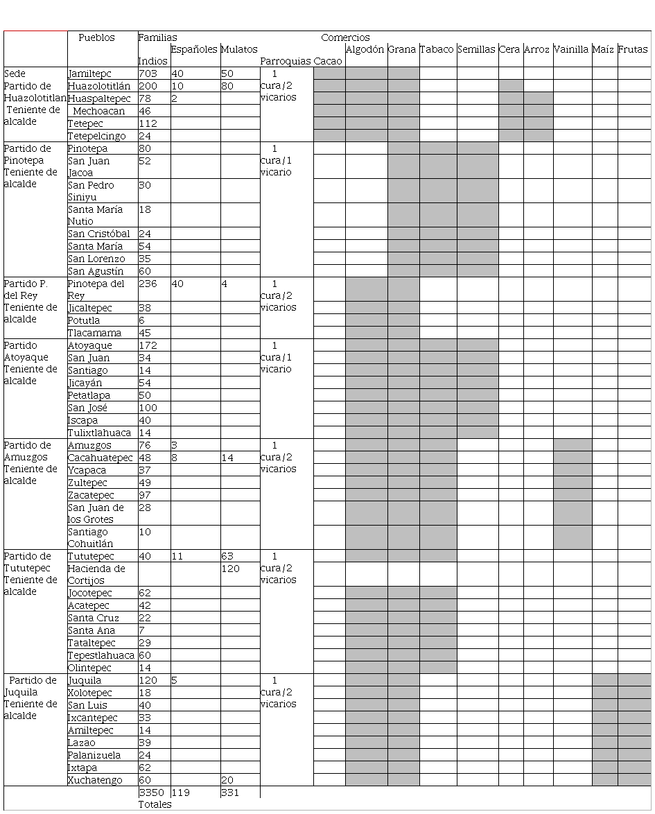 Esta provincia se dividía en siete partidos. En el pueblo de Jamiltepec residía el alcalde mayor y, a su vez, formaba parte del partido de Huazolotitlán, donde un cura y dos vicarios brindaban los servicios espirituales. Este curato se componía de cuatro pueblos sujetos, siendo la cabecera la más populosa con 200 familias de indios, 10 de españoles y 80 de mulatos, teniendo como principales productos de comercio el cacao, algodón y grana. Entre 1777 y 1778, este curato contaba con cuatro familias de españoles, 600 indios “de todos estados” y de mulatos 500 “personas de todas edades” (Esparza, 1994, p. 138). [Ver Cuadro 1]