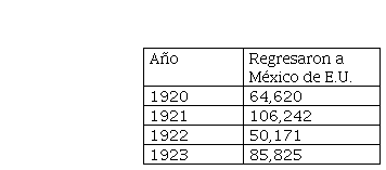 La tendencia al crecimiento de la migración mexicana, desde comienzos del siglo XX y durante la década de 1910, se vio brevemente frenada por la recesión económica de la posguerra (1920-1922). A finales de 1920 cientos de mexicanos fueron despedidos de sus empleos. Se calcula que 100 mil perdieron sus empleos en labores agrícolas e industriales (empacadoras, fábricas de acero, minas, entre otras) que realizaban en Michigan, Arizona, Chicago, Nueva York, Filadelfia, Kansas City, Texas y California, particularmente en Los Ángeles (Cardoso, 1977, pp. 579-581, 584). Según datos oficiales mexicanos, en 1920 la migración de retorno alcanzó la cifra de 64,620 y en 1921 llegó a 106,242 —la mayor cantidad de retornos en toda la década— (Gamio, 1930, p. 21, tabla III).