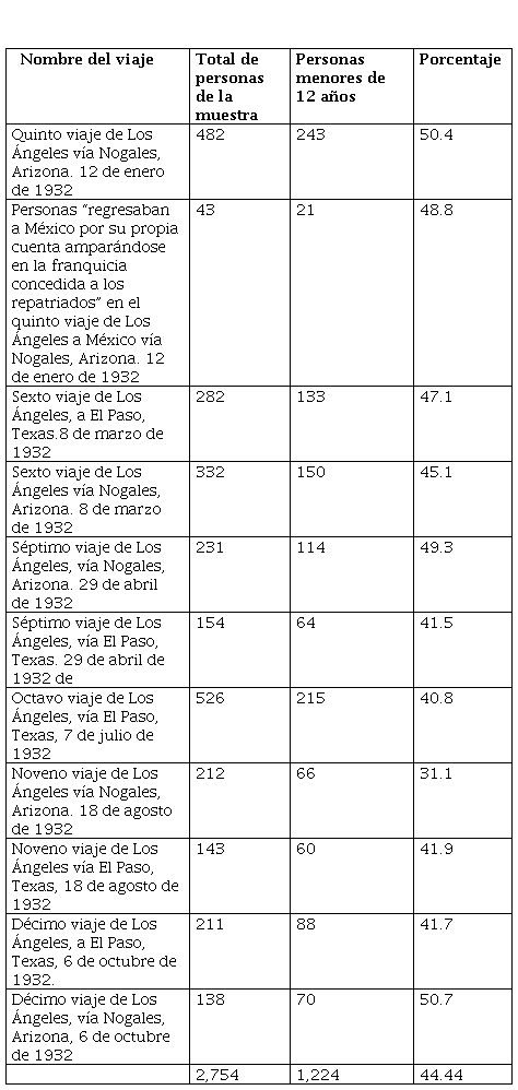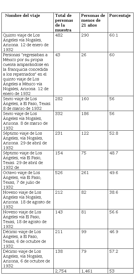 El 23 de marzo de 1931 salió el primer contingente rumbo a El Paso, Texas. El 12 de diciembre de 1933, un quinceavo viaje partió de Los Ángeles, con 412 personas; un balance realizado a finales de ese año arrojaba un total de 15 viajes y 12,668 “mexicanos que fueron transportados a México” (Hoffman, 1974, p. 106). Aquellos que participaron fueron principalmente familias del área urbana y suburbana, conformadas por migrantes que habían llegado a Estados Unidos en la segunda mitad de la década de 1910 y principalmente en la de 1920 —y sus hijos nacidos en Estados Unidos y en México—, quienes sufrieron más las consecuencias del desempleo y la miseria de la recesión, así como quienes fueron más vulnerables a las presiones para que abandonaran ese país. Muchos de ellos eran quienes tenían menos raíces en esa sociedad, escasos recursos para sostenerse y parientes cercanos en México a quienes podían recurrir. El contingente en el cual se movilizaron las personas de 13 a 21 años que aquí se estudian estaba compuesto por 2,754 personas quienes fueron trasladas en 11 diferentes viajes de Los Ángeles a El Paso y Nogales; 1,461 de ellos tenía menos de 21 años, o sea el 53 por ciento de la muestra, lo cual indica que en su mayoría estaban en la etapa de la niñez, adolescencia y juventud temprana; el resto sobrepasaba los 21. Estaban divididos en 778 mujeres y 683 hombres, lo cual evidencia una importante presencia de ellas en el total de la muestra obtenida: 53.25 y 46.74 por ciento respectivamente —más de la mitad eran mujeres—. Asimismo, estuvieron organizados en 409 familias.