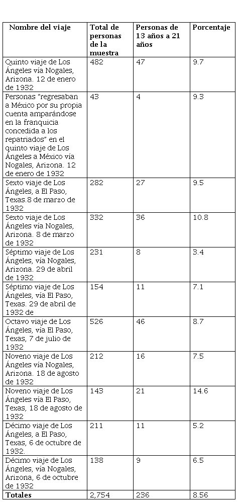 El objetivo de este artículo es analizar el porcentaje de personas de origen mexicano, entre 13 y 21 años, que participaron con sus familias en los viajes que organizó el condado de Los Ángeles a la frontera, entre enero y octubre de 1932. El resultado del análisis de las “listas resumen”, que elaboró el cónsul de México en Los Ángeles, muestra que sólo el 8.56 por ciento, de un contingente de 2,754 que se trasladaron a México, estaban en ese rango de edad; es decir, fue un grupo poco representativo en el total de aquellos que se movilizaron a México.