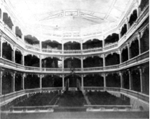 Sin embargo, sería el Teatro Calderón el que tendría una de las mayores afluencias en la sociedad tepiqueña, ya que se trataba de un espacio destinado exclusivamente para las funciones de ópera. Al principio se trataba del Coliseo, un espacio de acceso público, al aire libre, que podía transformar su escenario con facilidad para representar distintos tipos de funciones circenses, ecuestres, o incluso taurinas, debido a que se trataba de una arena de planta circular, como si se tratara de un coso por su falta de cubierta en el escenario y en las gradas de los espectadores. Basil Hall aludía que su escenario estaba construido de tablones sueltos, las paredes eran de carrizos encalados, las techumbres hechas de ramas de palma y los decorados de tela, además de que tenía la Luna como proveedora de luz por las noches (Muriá y Peregrina, 1992).