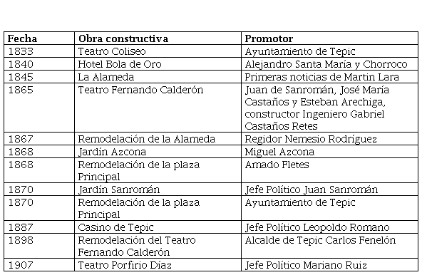 Se trataba de lugares construidos con el propósito de instaurar nuevos modos de vida en la mayoría de los estratos sociales, particularmente en la elite urbana, promovidos por la ya mencionada oligarquía tanto local como extranjera [ver cuadro 1]. Los espacios tendrán un alto grado de funcionalización debido a la complejidad, particularidad y sofisticación de las actividades que se desarrollaban en ellos, por lo que su diseño era complicado de ajustarse a lo ya edificado previamente, además de que su estética variaba de acuerdo a la posición social de los usuarios que los visitaban. A consecuencia de su aparición en la ciudad y de la atracción que tenían respecto a la imagen urbana establecida en Tepic, dichos espacios se convertirían en un referente geográfico y simbólico de modernidad occidental decimonónica, en contraste con los remanentes del pensamiento ilustrado borbónico. Por ello habría una constante remodelación, reutilización y resignificación de jardines, plazas y teatros en la ciudad (Ramos, 2016).
