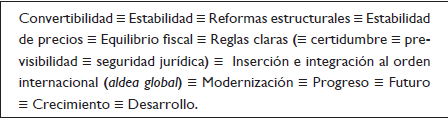 El éxito estabilizador de la convertibilidad, en ese marco, permitía reforzar la cadena de equivalencias entre las reformas promercado y la estabilidad económica, edificando un núcleo orgánico que condensaba sólidamente a estos significantes nodales de la hegemonía menemista (Fair, 2014).