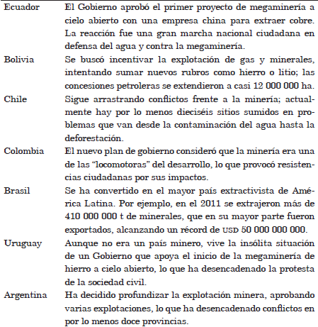 elaboración propia a partir de Gudynas (2009).Este cuadro refleja ejemplos y tendencias de las inversiones llevadas a cabo por los Estados de América del Sur y, como bien lo explica Eduardo Gudynas (2012), la minería, hidrocarburos y monocultivos han recibido grandes inversiones y se han iniciado nuevos emprendimientos en casi todos los países. Se apela a prácticas cada vez más intensivas, a veces utilizando productos tóxicos y peligrosos, muchas veces usando explosivos, y se cubren áreas geográficas mayores, afectando por ejemplo las cuencas hidrográficas. Viejos emprendimientos son reactivados y profundizados, y países que no eran extractivistas ahora están comenzando a serlo.