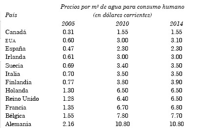 En afán de definir un valor nominal al agua dulce, algunos países ya han implementado diversos métodos e instrumentos no sólo para racionalizar su uso, sino también para ampliar su cobertura ante la creciente dinámica demográfica y el aumento de la demanda de dicho recurso. A sabiendas de que este no es renovable, su calidad frecuentemente indeseable (por la contaminación) y su disponibilidad cada vez más limitada han provocado que el precio se incremente gradualmente, tal como se aprecia en el Cuadro 1, lo que se convierte en una seria restricción a su consumo, al grado de considerarla como un recurso club (“club godos”) cuyo disfrute será para quien pueda pagar o asumir el costo correspondiente (Zegarra, 2014).
