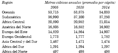 En el Cuadro 2, se aprecia este panorama, donde Europa Occidental, Asia Central y del Sur y África del Norte y del Sur son las regiones que más problemas hídricos de consumo humano presentan, pues la cantidad de agua dulce en sus subsuelos es muy inferior a la tasa de crecimiento y demanda poblacional, lo que explica, en parte, los altos niveles de marginación y pobreza que caracterizan a dichas regiones. El resto de los países no escapa de esta situación racionada del agua, ya que el nivel de reposición (regularmente por lluvia) es cada vez más lento y la demanda per cápita del agua dulce es creciente, lo que deja en claro la disputa creciente de este recurso, haciéndolo cada vez más escaso y altamente valorado.