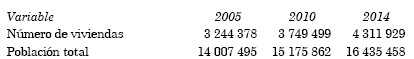 En el Cuadro 4, se aprecia que en los siguientes catorce años se presentó un tasa de crecimiento acumulado de 61.6% en el número de viviendas, para llegar a 4 311 929 en el último trimestre de 2014. En este mismo lapso, la población creció 25.6% (inegi, 2000, 2005 y 2010). Al contrastar esta dinámica creciente con la disponibilidad de agua para consumo humano se abre una gran brecha, convirtiéndose esta en un recurso que cada vez es más escaso, caro y de difícil acceso.