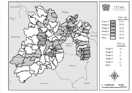 Axapusco, Ayapango, Ecatzingo, Jilotepec, Joquicingo, Juchitepec, Luvianos, Ozumba, San Simón de Guerrero, Soyaniquilpan de Juárez, Tejupilco, Temascaltepec, Tenango del Aire, Tepetlixpa y Timilpan integraron el bloque cinco, cuyo costo de suministro fue de mxn 4.48 por m3. Los municipios restantes, más alejados al Valle de México, ubicados al norte y sureste de la entidad, cuyo carácter es eminentemente agrícola y rural, se agruparon en el bloque seis, asignándoles la cuota más alta: mxn 9.64 por m3. Este monto se determinó en función de la distancia entre el centro de extracción-distribución del agua y la ubicación de las zonas habitacionales y viviendas, cuya dispersión y traza irregular provoca incrementos en la inversión de infraestructura, así como mayor desaprovechamiento por fugas.